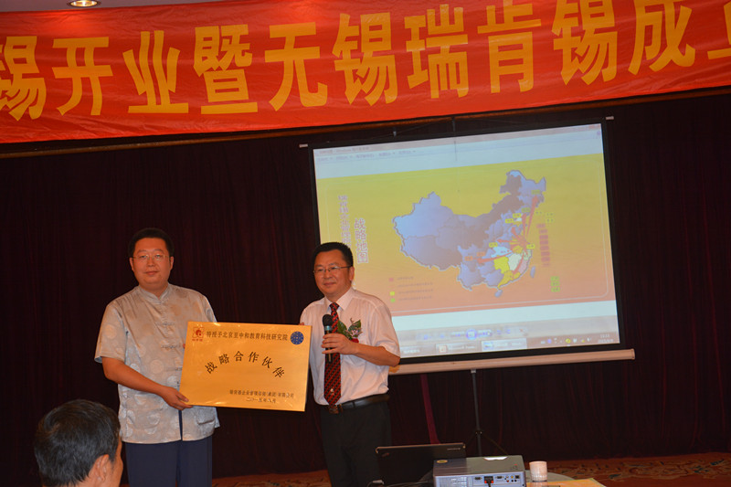会上,专程从无锡赶来参会的无锡机械联合会曹风德会长发表了热情洋溢的致辞。从2008年的无锡首次庆典,到2015年青岛公司开业,曹会长欣喜的见证着瑞肯锡的不断成长。首家客户—青岛振海船舶的梅总代表青岛温州商会和振海船舶向李董赠送了礼物。会上,李董向孙高平院长赠送了“瑞肯锡—北京至中和国学研究院战略合作伙伴”铜牌。