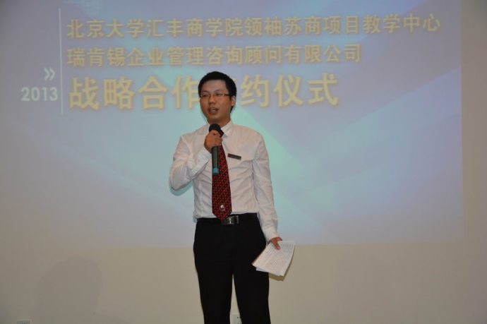 10月12日,瑞肯锡企业管理顾问(集团)有限公司和北京大学汇丰商学院领袖苏商项目教学中心战略合作签约仪式在无锡举行。 双方领导人就如何更好的服务长三角地区企业,如何从课程学习、观念转变到落地实施建立了战略合作框架。北大汇丰商学院江苏中心王芳主任发表了未来合作构想,瑞肯锡集团公司李学林董事长就具体合作方案做了部署。